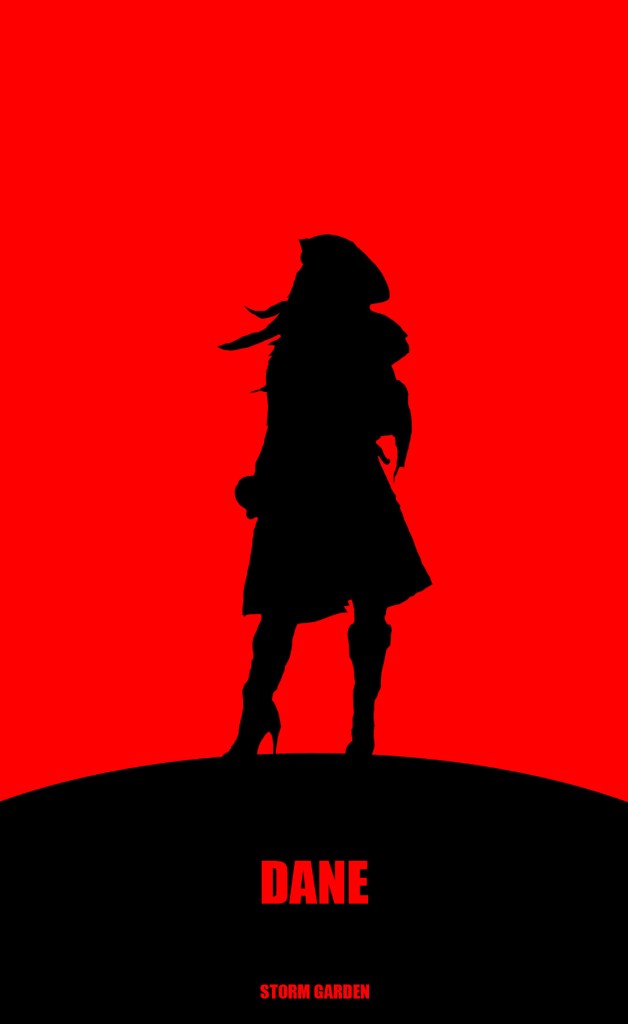 The characters’ jagged silhouettes against a blood red sky represent Storm Garden’s visceral and sometimes violent world. With certain details omitted, their features are left to the reader’s imagination. While some outlines are crisp, others appear weathered or crumbling. Witzger is painted with amine brushstrokes, signifying the character’s conceptual origin.