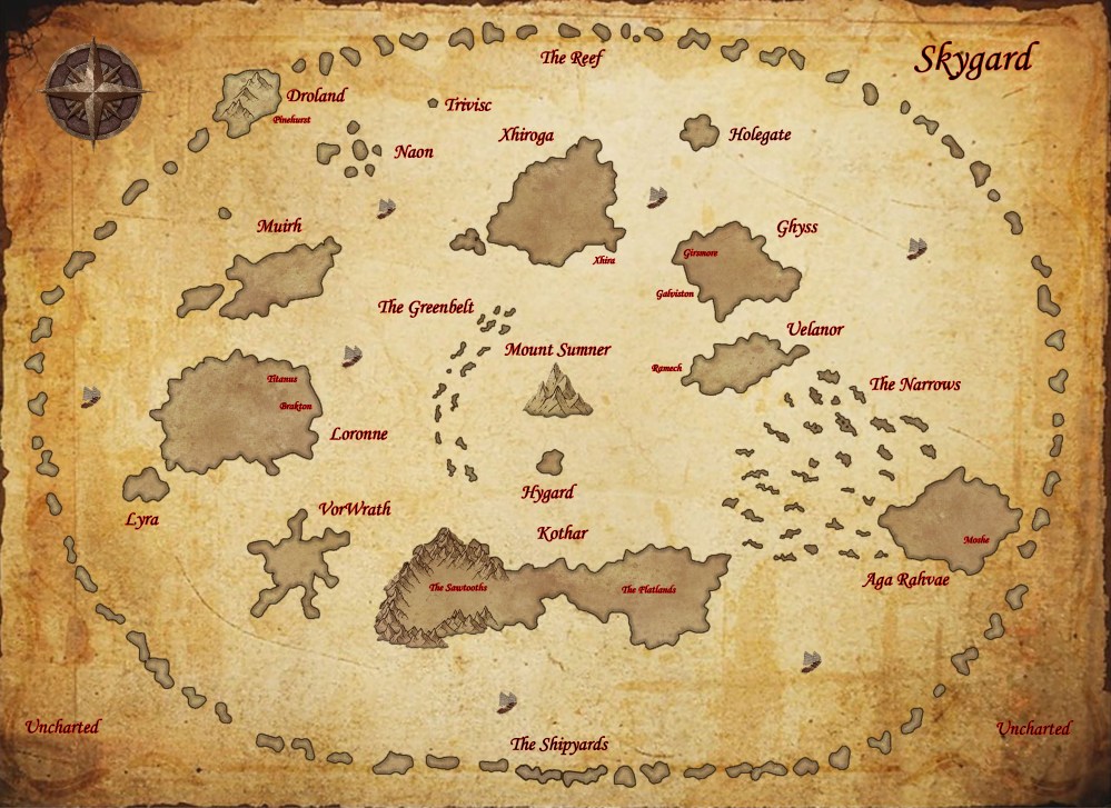Down the page you’ll find a map of Skygard. Beyond the Reef is mostly uncharted sky. Instead of designing a loose collection of islands, I wanted a clear perimeter between civilization and the unknown. This is also true of the Shroud, the toxic cloud which separates Skygard from the shattered world below. The characters are literally surrounded by mystery.